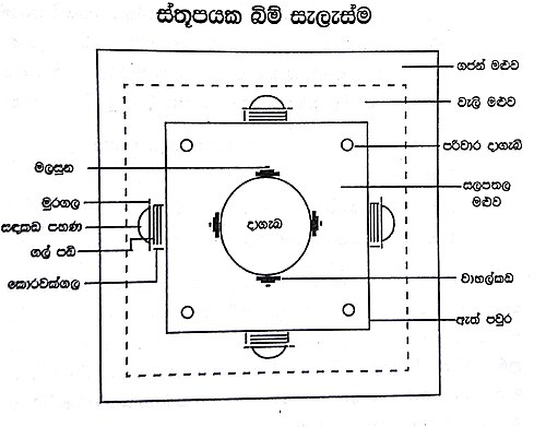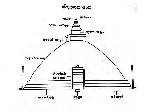 ♦ ඉන්දියානු ස්තූපයේ සතරැස් කොටුව ''භර්මිකාව'' නමින් ද, පේසා වළලු ''මේධිය නමින් ද, කොත් කැරැල්ල වෙනුවට ගලින් නිර්මිත සේසත ''ඡත්රය'' යන නමින් ද හැදින්වේ.